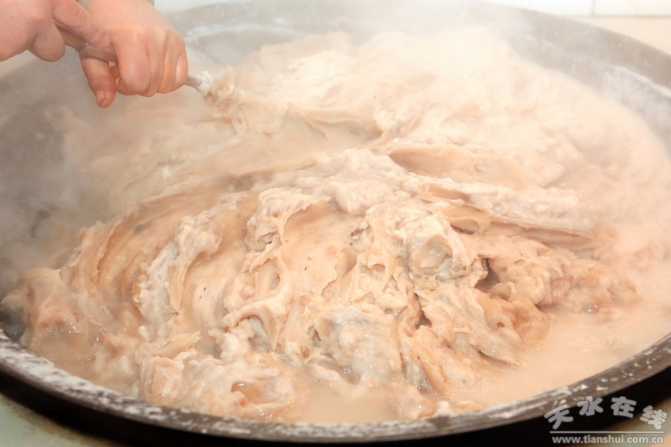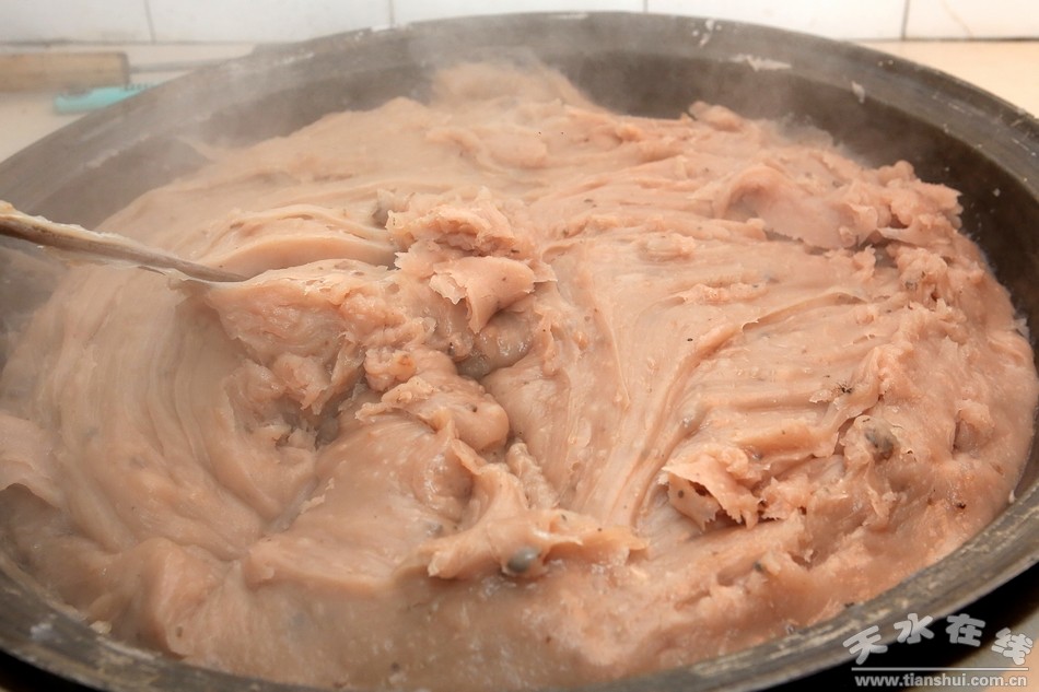 12月3日清晨5时,当大多数人还在沉睡当中的时候,位于天水市秦州区中华东路步行街一家小区的常记呱呱第三代掌门人常定军一家已开始了一天的忙碌。只见常家后院堆满了制作呱呱的各种器具。磨浆的石碾,过滤淀粉的各种面盆,炉火通红的灶台,热气腾腾的大锅,忙碌的人们,而常家当天的第一锅呱呱已经快要出炉了。据常记呱呱第三代传人常定军媳妇张巧玲介绍,常家人从上世纪70年代制作呱呱至今已经已经有40多个年头了。