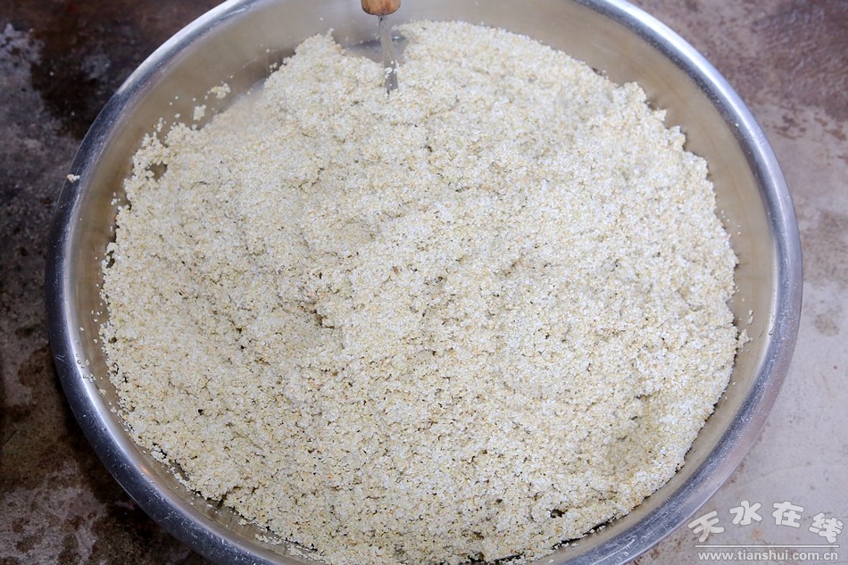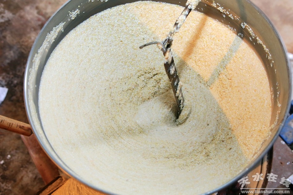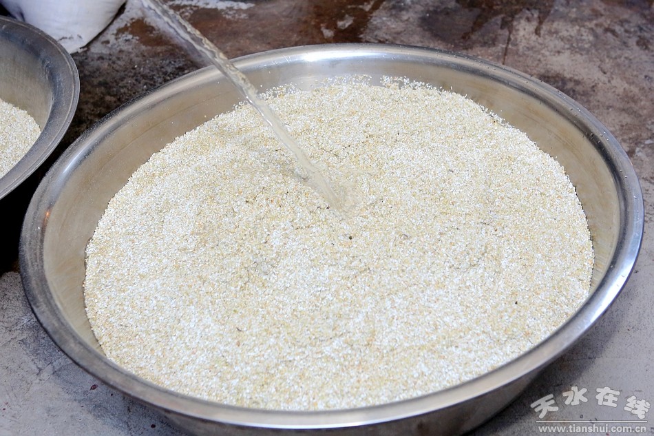 (用电动石磨碾压用水浸泡过的荞麦珍子)
