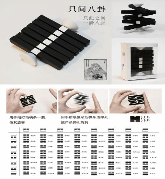 该作品由“接点工作室”选送,创作者:蒋方。《只间八卦》设计理念,创作者认为:伏羲八卦作为一种符号系统,代表了宇宙中的阴阳、五行等元素,用以解释宇宙的运行规律。“只间”意指只此之间,当下瞬息的时间,这与八卦所代表的宇宙生成与变化的规律相呼应。将这款以八卦六爻为原型的现代文创玩具随身携带,在指尖转动的一刻,意在以轻盈的方式引发年轻群体对中国传统哲学文化的兴趣和探索。同时以在青年人群之间建立分享欲为目标,将天水深远的传统文化传播到更远的地方。