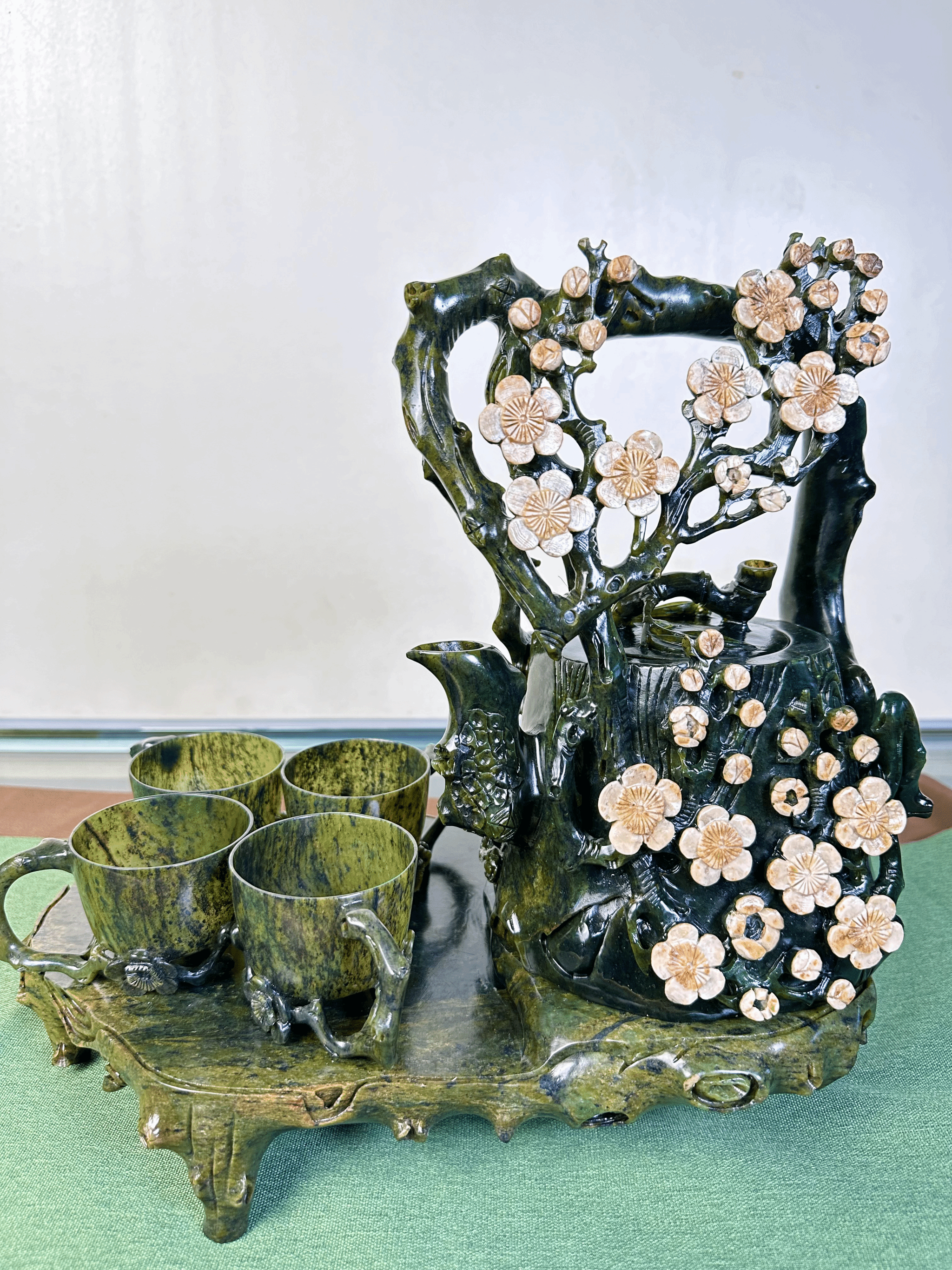 该作品由甘肃瑰宝通汇珠宝有限公司陈佳丽报送。树桩石皮梅花提梁壶,沁皮俏色巧雕,壶上及壶盖为梅花盛开,壶柄为开花的梅枝,花朵柔中带刚,花枝刚健有力,自有一番清逸韵味。雕刻精细生动,壶内为空,可泡茶。流嘴、执把、壶钮皆以苍劲的梅杆塑成,壶身以曲绕遒劲的梅瓣梅枝点缀。生动逼真的梅花梅朵从枝干上冒出,攀沿至壶身,错落有致,梅花或盛开或待放,姿态优美动人。梅花“禀天质之至美,凌岁寒而独开”,梅花生得一身傲骨,不畏严寒淡然芬芳,寓为君子,梅花盛开也意指福到富贵。