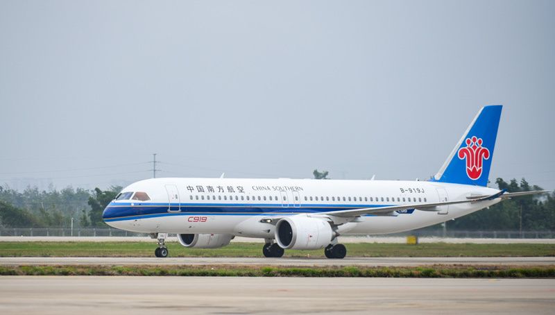 2024年12月11日,由C919执飞的中国南航CZ6786航班在海口美兰国际机场降落,国产大飞机C919在海南的商业飞行“首秀”顺利完成。新华社记者 杨冠宇 摄