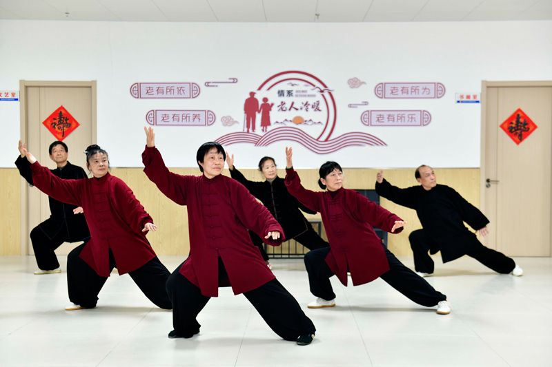 2025年3月12日,在山东省菏泽市郓城县中央悦府综合养老服务中心,老人在打太极拳。新华社记者 郭绪雷 摄