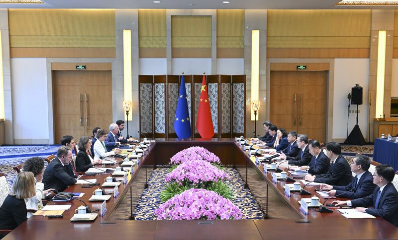 7月14日下午,中共中央政治局常委、国务院副总理丁薛祥在北京同欧盟委员会执行副主席里贝拉举行第六次中欧环境与气候高层对话。新华社记者 张领 摄
