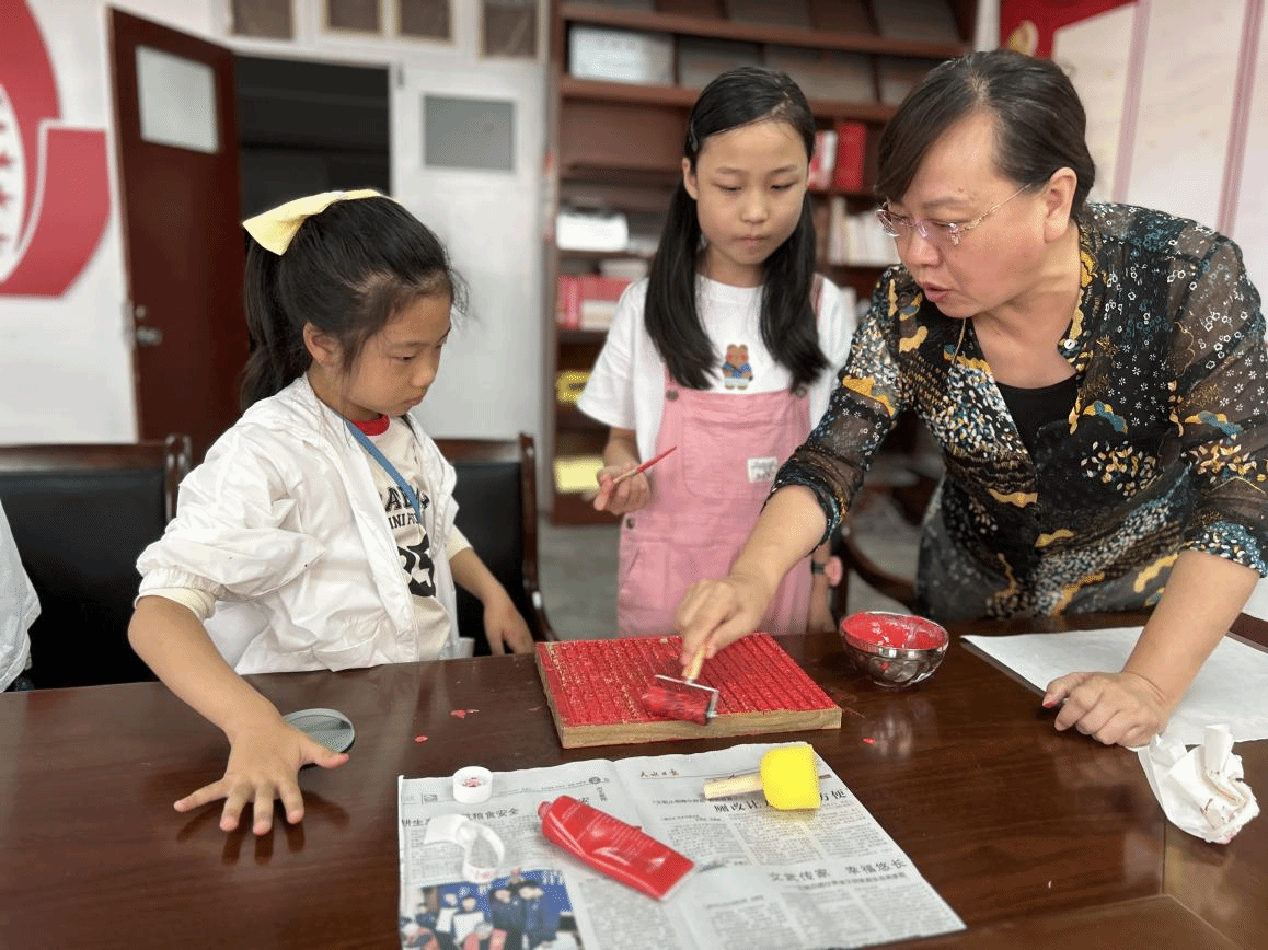 教学内容完成后,开始手工制作体验。在古籍部老师们的现场指导下,小读者们两两配合,上墨、覆纸、刷印、起纸、晾干,在一拓一印之间,将技艺变为实物作品,体验了雕版印刷中的油墨印刷环节。作品完成之后,孩子们把各自的雕版印刷作品镶嵌在画框中展示,并由古籍部老师带领参观馆藏古籍,零距离感受中华优秀传统文化的书卷之美。
