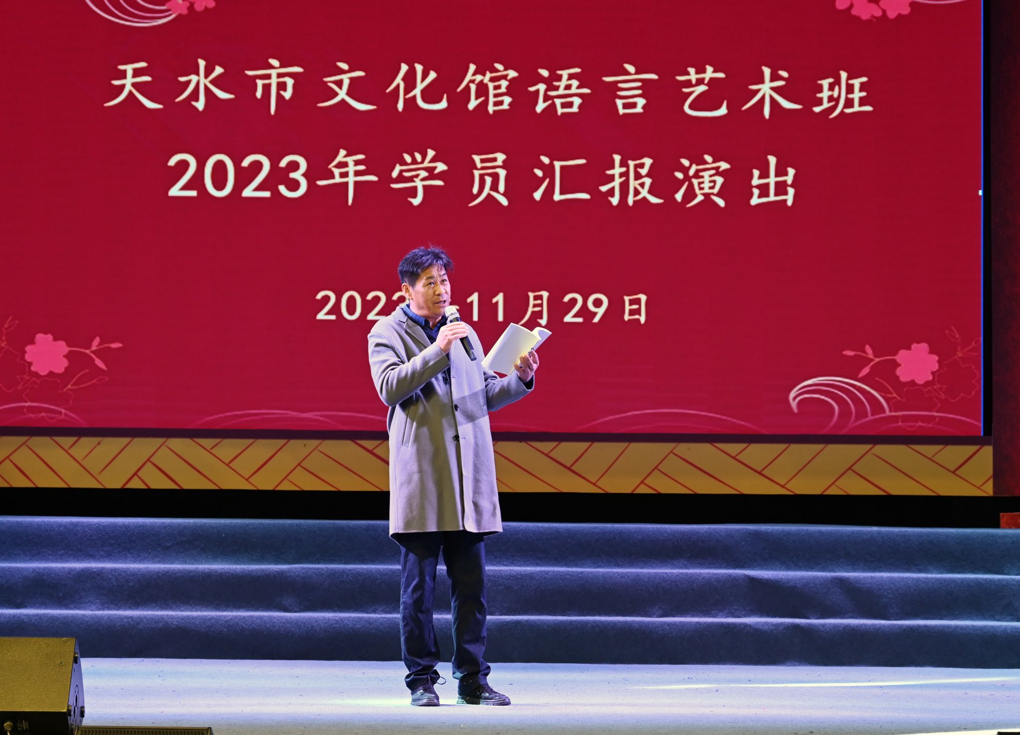 11月29日,天水市文化馆语言艺术公益培训班2023年汇报演出在纪信词院内文艺厅举办,天水市文化馆副馆长、语言艺术班教师曹文成和学员60余人参加了汇报演出。本次学员汇报演出还特邀天水师范学院音乐舞蹈学院副教授、甘肃省舞蹈家协会会员、天水市舞蹈家协会名誉主席海和平、天水职业技术学校讲师、国家级普通话测试员时红娅莅临指导。