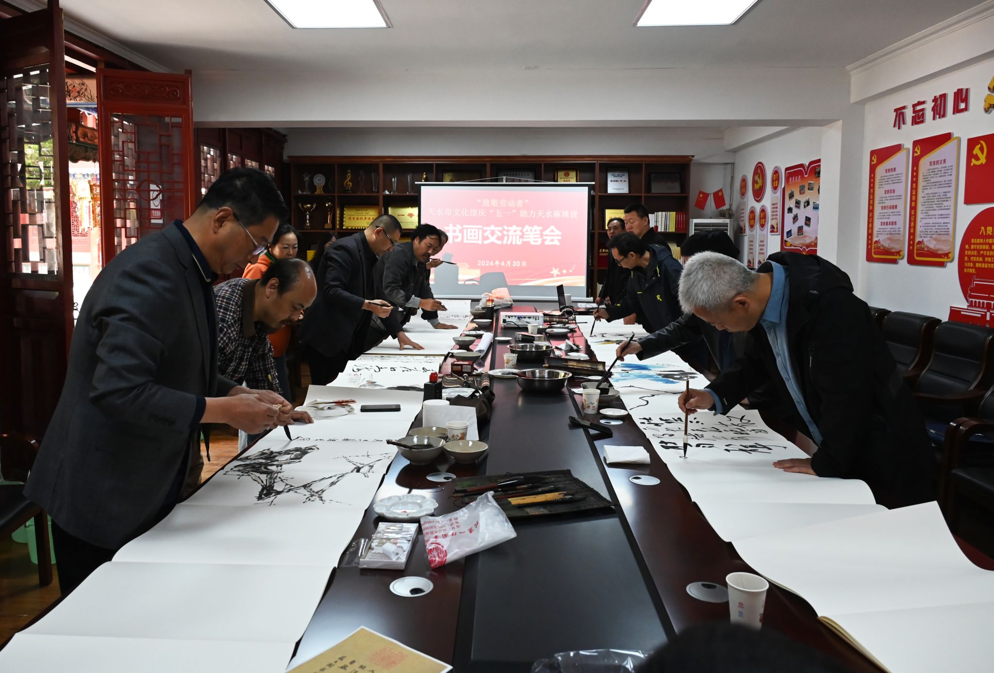开幕式后,市文化馆组织我市书画名家曹宝凌、祁国荣、高全生、成友文等十余人开展了"致敬劳动者"天水市文化馆庆"五一"助力天水麻辣烫书画交流笔会,各位书画家以饱含深情的笔墨创作了五本主题鲜明、内容积极向上、形式新颖的册页,向劳动者致敬,助力天水麻辣烫,激励和引导全市青年牢记历史使命,团结奋斗,锐意进取,以积极向上的精神风貌踊跃投身于天水市经济文化建设,共谱文明社会新风,为全面开创现代化强市贡献青春力量!