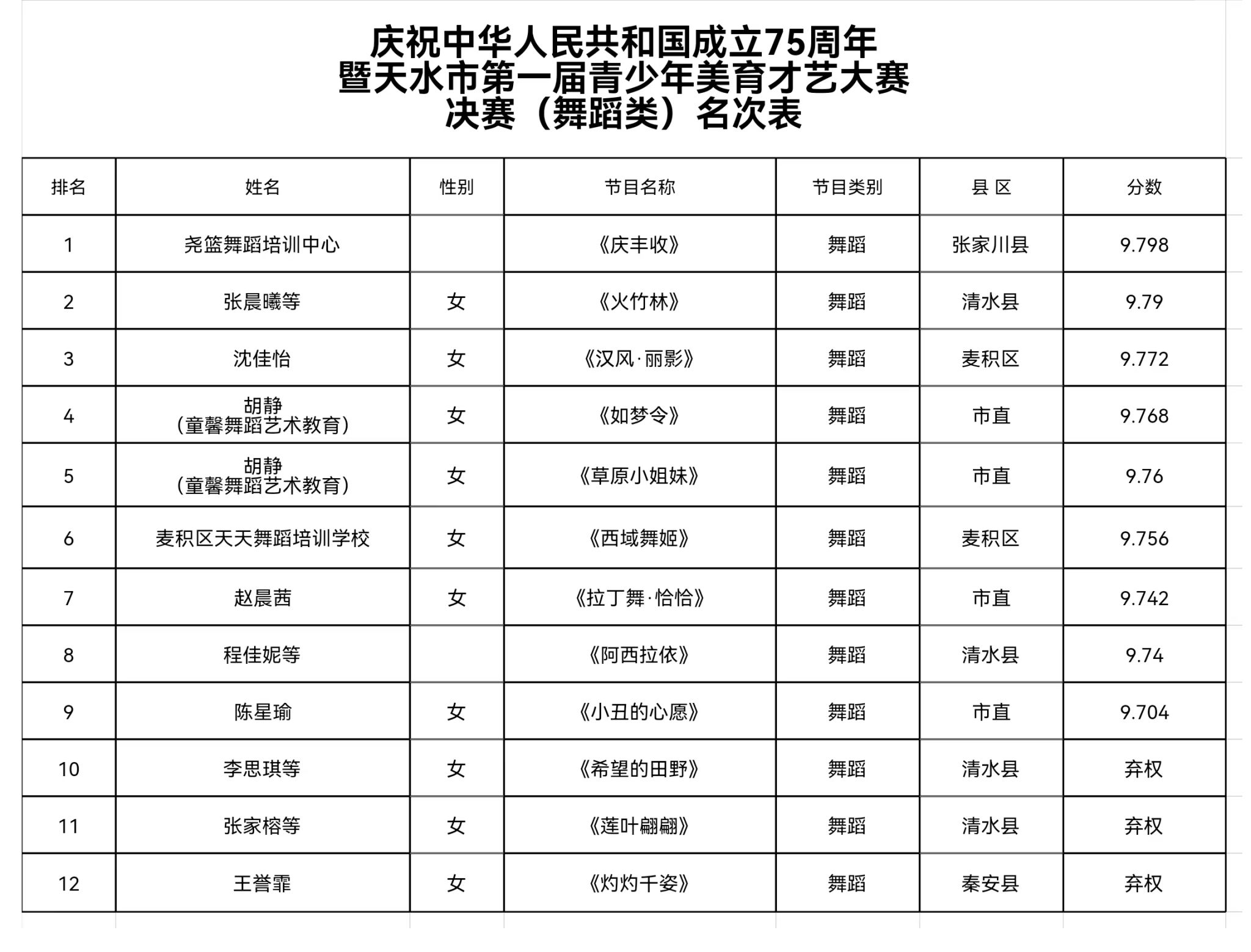 8月6日,为庆祝中华人民共和国成立75周年,充分发挥文化馆赓续中华传统文化、弘扬美育精神、践行全民艺术普及的重要使命,进一步加强未成年人美育教育,由中共天水市委宣传部、天水市文化和旅游局、中国共产主义青年团天水市委员会主办,天水市文化馆、各县区文旅局承办,各县区文化馆协办的庆祝中华人民共和国成立75周年暨天水市第一届青少年美育才艺大赛决赛圆满结束。