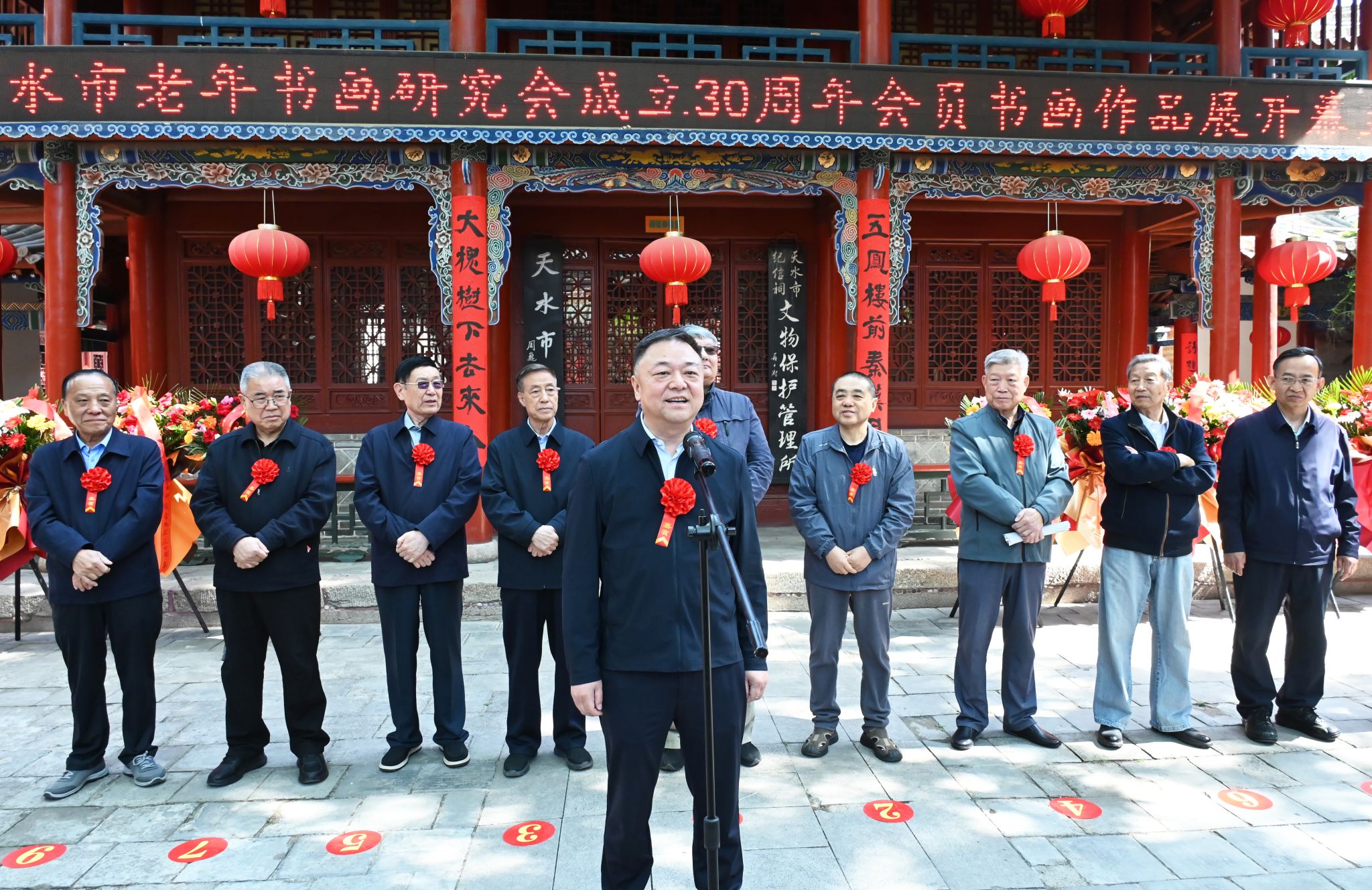 中国老年书画研究会书记王吉,中国老年书画研究会专家委员会副主任常丰威,兰州文化联谊会副会长余映才,天水市人大常委会原主任张建杰,天水市政协原主席王志荣等相关退休领导以及天水市委老干部局、市老年书画研究会、天水市文化馆等相关负责人、社会各界书画艺术家、爱好者共200余人参加了开幕式并观看了展览。
