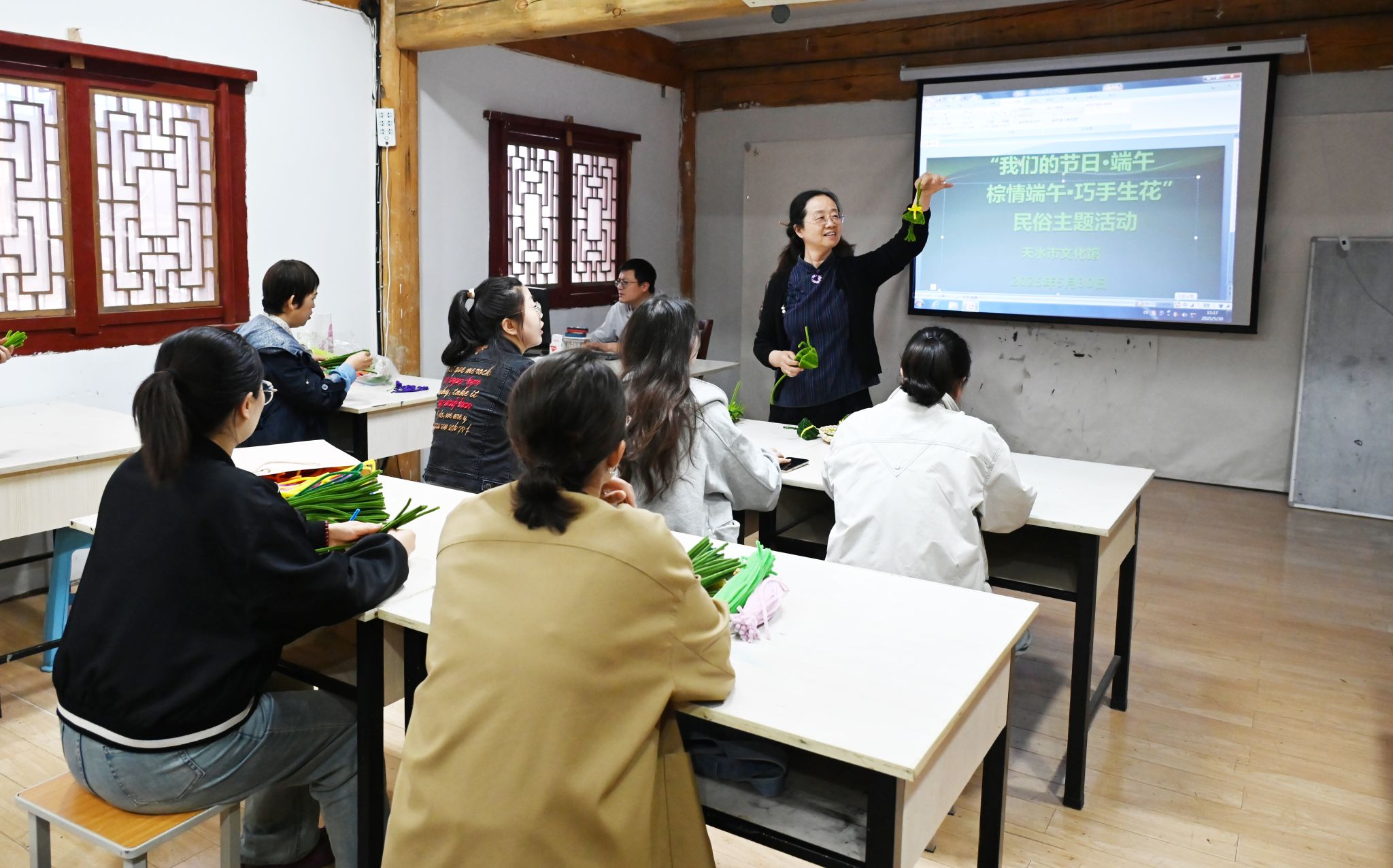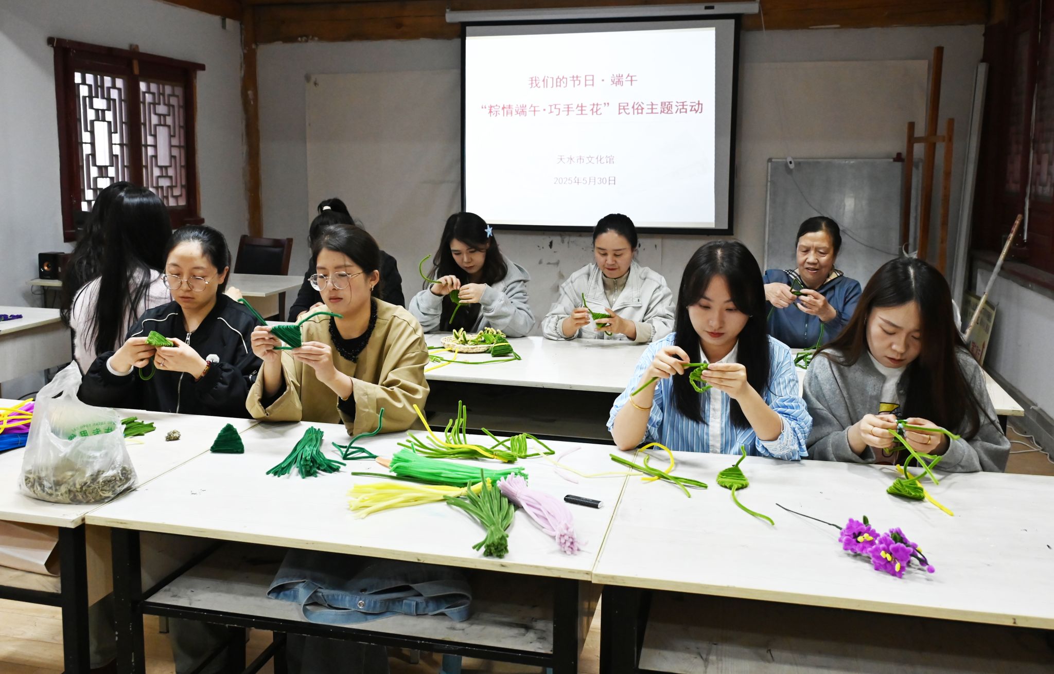 在端午佳节来临之际,为弘扬中华优秀传统文化,丰富群众精神文化生活,天水市文化馆组织全体职工与绒花制作培训班学员一起开展“我们的节日·端午—‘粽情端午·巧手生花’”民俗主题活动,通过包粽子、制作绒花等特色活动,让传统节日焕发新的生机与活力。