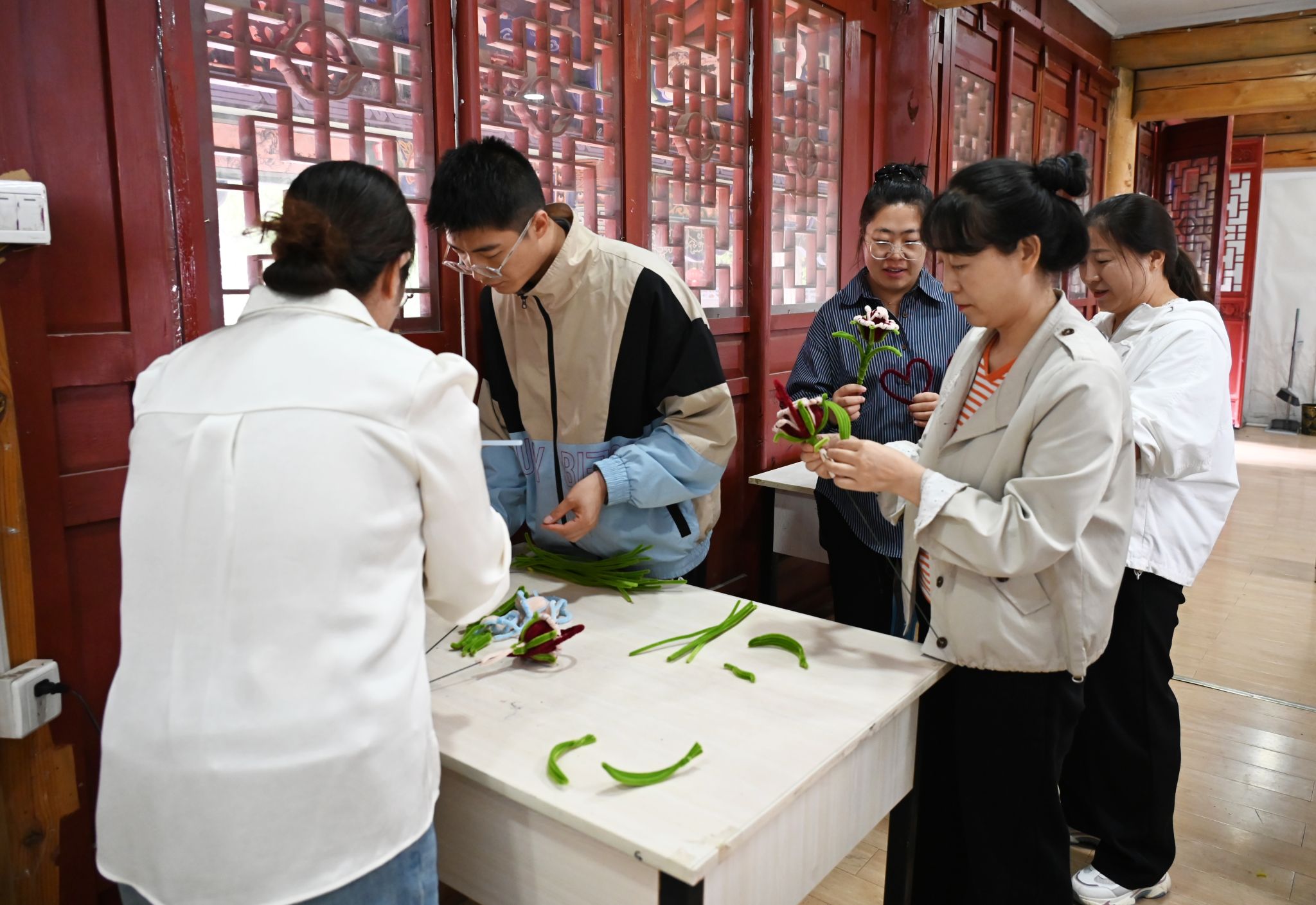 活动现场,洋溢着欢乐温馨的氛围。在绒花制作环节,绒花制作技艺传承人细致讲解绒花的历史渊源与制作技艺,每一位参与者认真聆听,仔细观察,随后迫不及待地动手尝试。从勾条、打尖到传花,每一个步骤都充满挑战,但大家相互交流、互相帮助,在欢声笑语中逐渐掌握了制作技巧。不一会儿,一朵朵色彩明艳、形态逼真、充满浪漫情调的爱心玫瑰在她们手中绽放。