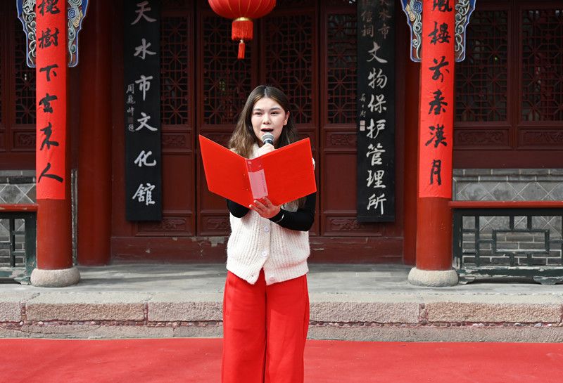 活动尾声,天水市文化馆副馆长、语言艺术公益班教师曹文成引领全场,齐声吟诵起唐诗《早春呈水部张十八员外》和现代诗歌《没有一艘船能像一本书》。朗朗书声如春潮涌动,拂过古建筑的每一道檐角,在砖木之间轻轻回响,将阅读的热忱推向了云端,也让书香文脉在声声合诵中余音袅袅,绵延不绝。