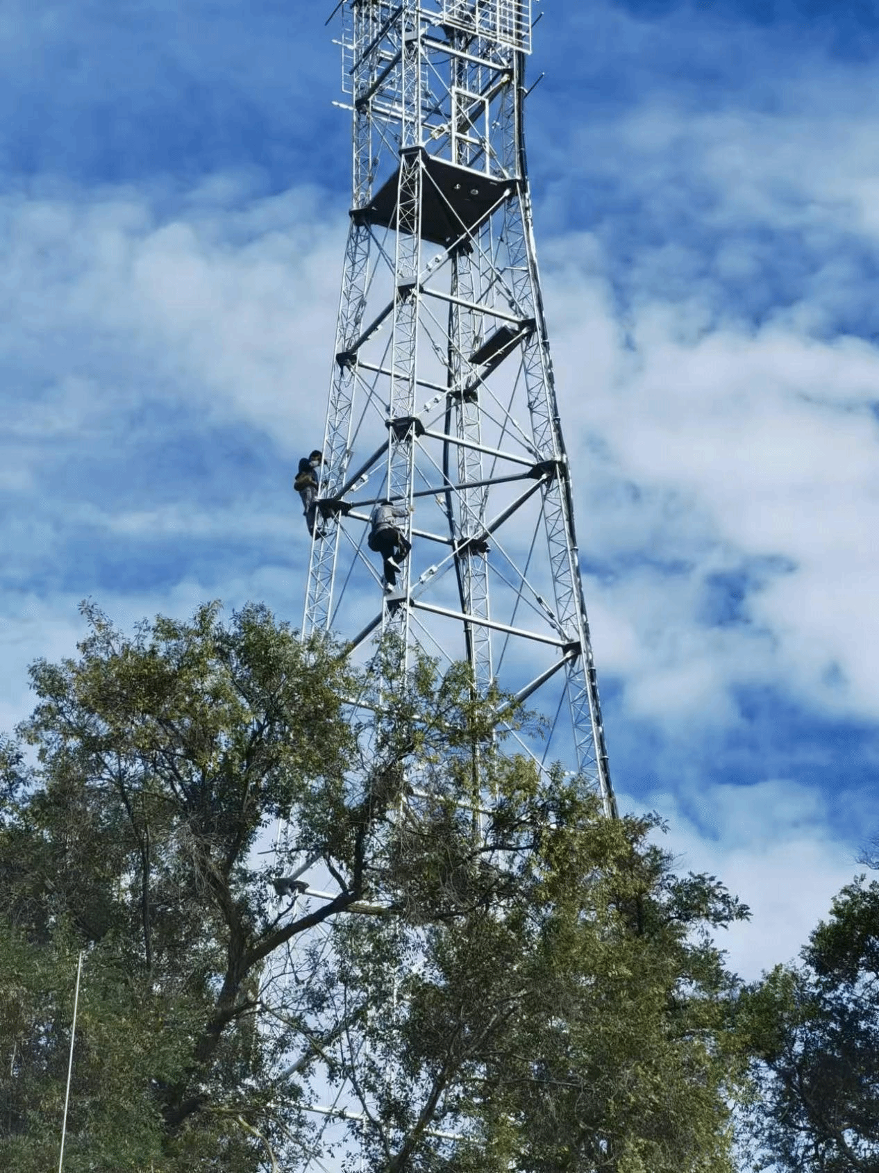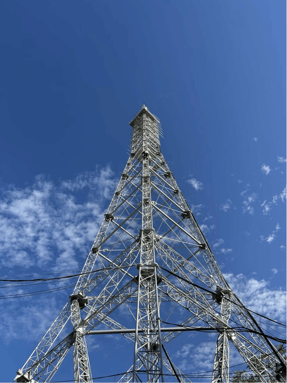 此次维护的自立式广播电视信号发射铁塔于1979年投入使用,塔高76米。今年4月我台对该塔进行了检查,发现塔身链接出现大范围锈斑,链接螺丝有松动等安全隐患。
