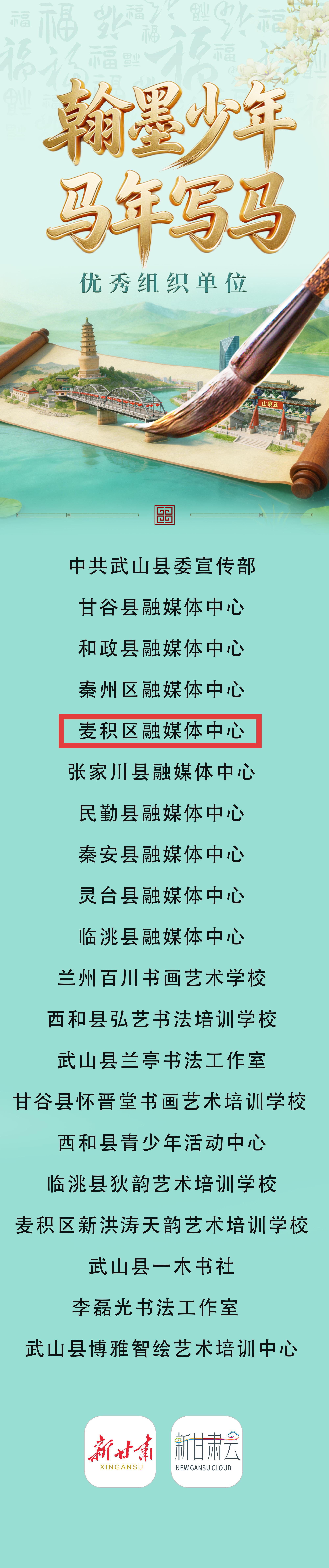 近日,由甘肃新媒体集团新甘肃客户端主办的“翰墨少年・马年写马”新春书法网络祝福活动圆满落幕。该活动联动全省各级融媒体中心开展,麦积区融媒体中心凭借高效的组织策划、广泛的群众动员以及优异的活动成果,获评“优秀组织单位”,充分彰显了融媒体平台在文化传承与传播工作中的责任和担当。