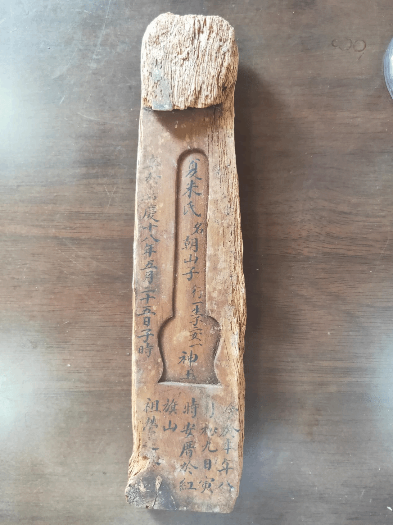 这件木器是2016年前后夏新民等人在枣园庄修建水渠时无意间从土中掘出,之后一直保存在家中。今年听说博物馆征集藏品,他们商议后决定将这件藏品无偿捐献给博物馆。此件木主横5厘米,纵约25厘米,背部糟朽,正面阴刻浅龛,上有“夏朱氏”字样墨书,落款时间为“嘉庆十八年”,牌上的“红旗山”可与今秦州玉泉镇枣园庄红旗山相印证,具有一定的历史价值。