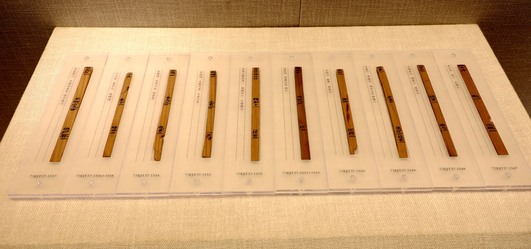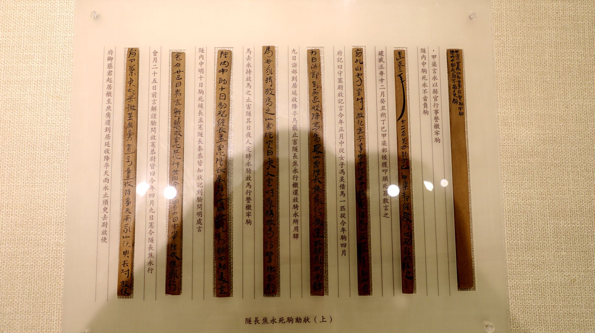 甘肃素有“汉简之乡”的美誉,简牍是甘肃最具特色的文物资源和重要文化标识。甘肃简牍博物馆藏有4万多枚简牍以及相伴出土的1万多件其它文物。该展览甄选了甘肃简牍博物馆馆藏居延、肩水、悬泉、敦煌简牍218组(316件)精品简牍文物,其中一级文物36件。展览以汉代西北屯戍吏卒的物资生活为主题,分为戍所、戍卒、边塞生活三个单元,犹如一幅徐徐展开的画卷,为公众展现了两千年前汉代戍卒驻守边塞的生活百态。