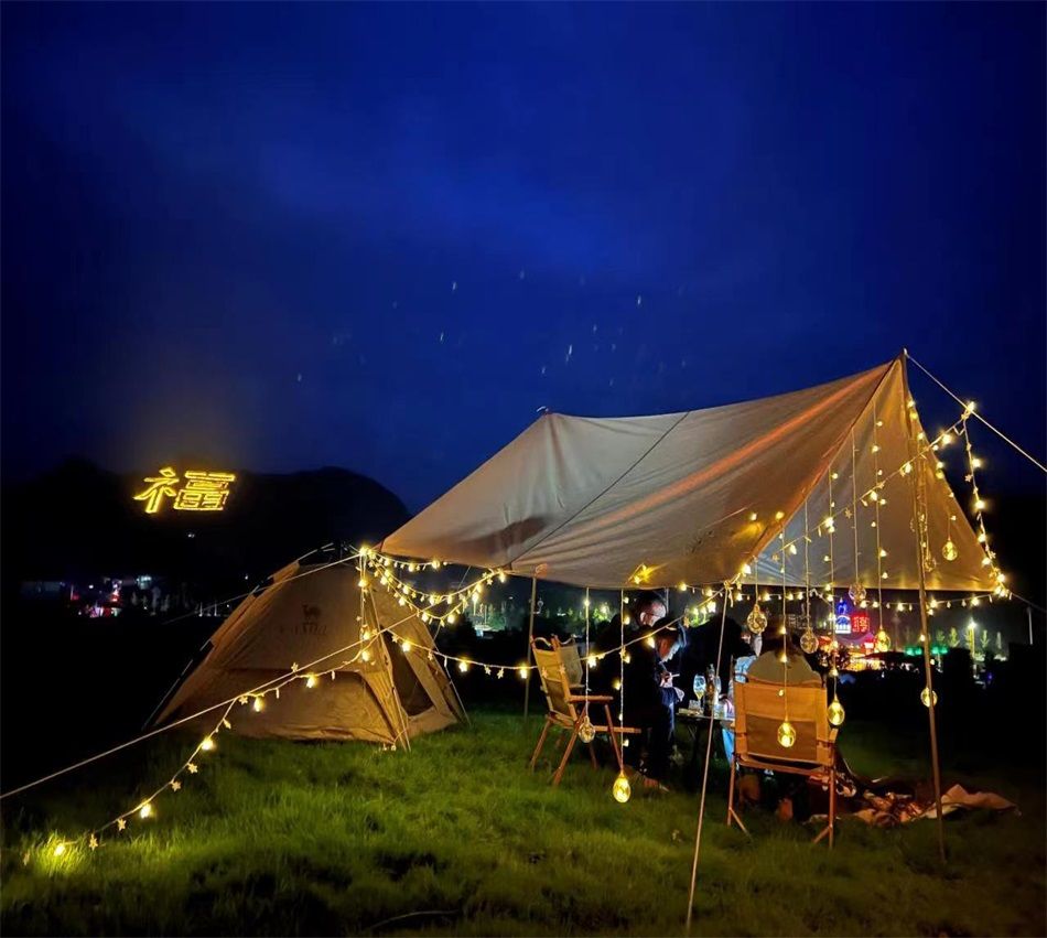 精品露营套餐:1天幕1帐篷2台8凳 ¥588元/6小时(适合10人以上使用)