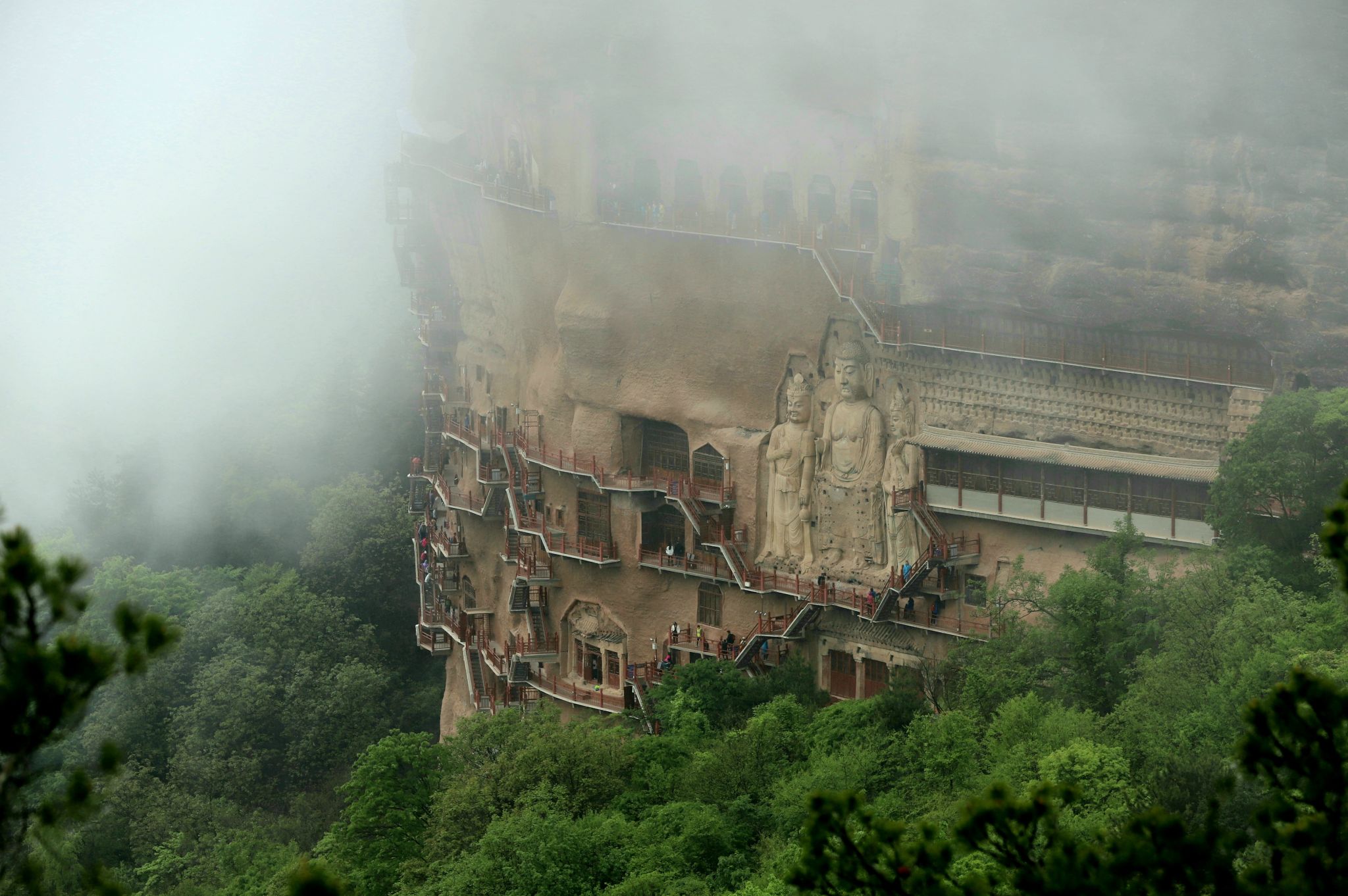 【麦积山石窟】麦积山又名麦积崖,孤峰崛起,犹如麦垛。山峰的西南面为悬崖峭壁,著名的麦积山石窟就开凿在这峭壁上。现保存窟龛221个,泥塑、石刻10632件,壁画1000余平方米。麦积山周围风景秀丽,山峦上密布着翠柏苍松、野花茂草,云雾阵阵,构成了 “麦积烟雨”。