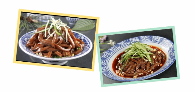 “凉皮” 凉皮用面粉制作而成,其制作方法是:将盐用温水化开和面。面要活得软硬适中。和好后醒20分钟左右,醒好的面加入凉水,用手揉捏面团,洗出淀粉,将洗好的面水倒入干净的盆中,再加凉水继续洗,直到洗出面筋为止。将洗好的面水沉淀三个小时后,将上面清水全部倒掉。将面水搅拌均匀。然后往蒸面皮的盘子里倒入一勺面水,入开水锅,蒸到凉皮鼓泡就熟了。出锅后将盘子放入冷水中冷却。蒸好的凉皮,切好后拌入黄瓜丝,豆芽。依个人口味用盐,油泼辣子,醋,酱油调味即可食用。
