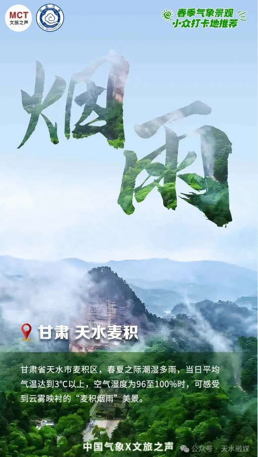 中国气象局气象宣传与科普中心联合文化和旅游部新闻中心推出的“春季气象景观小众打卡地推荐”海报推介说:“甘肃省天水市麦积区,春夏之际潮湿多雨,当日平均气温达到3℃以上,空气湿度为96%到100%时,可感受到云雾映衬的‘麦积烟雨’美景。”