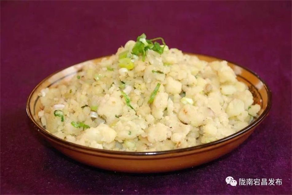 【宕昌洋芋蒸菜】将土豆擦成细丝,再拌以玉米面粉,使每一根丝上都均匀地裹上一层面,然后上屉蒸熟,然后加入青红椒、洋葱等辅料炒食或盛入大碗,调入蒜泥、辣面、酱、醋、葱油或香油拌食其味更佳。