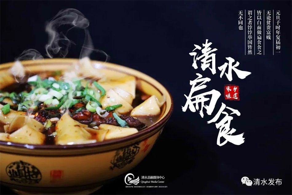 【清水扁食】一开二卷韭芽葱,皮似梯形腹内空,锅中翻身捞到碗,三钱臊子辣椒红。清水扁食作为当地居民早餐中最受青睐的小吃,其选料考究,烹饪过程复杂,入口滑爽,风味独特。