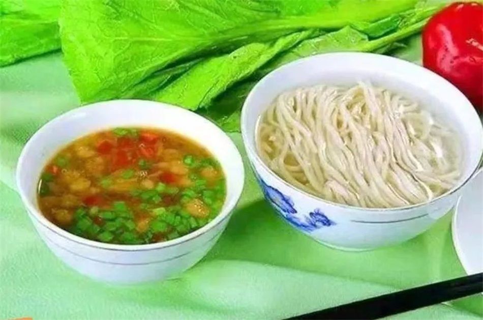 【出汤面】张家川出汤面分为汤和面两部分,汤是用红白萝卜、豆腐牛肉、黄花、木耳切成丁炒制成,汤料加入醋和油泼辣子各种佐料,将面条下熟捞入盛有凉开水的盆中,将汤汁舀入碗中端上桌,根据客人的食量将面捞在汤汁中吃,边吃边换汤。