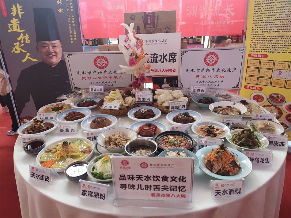 【天水八大碗】清朝乾隆期间“满汉全席”在全国饮食行业得到发展。“满汉全席”分为“上八珍”“中八珍”“下八珍”,其中八大碗被纳为“下八珍”。天水“八大碗”包括:一碗里脊、一碗红烧肉、一碗酥肉、―碗黄焖鸡、一碗杂烩、一碗豆腐、一碗粉条、一碗八宝甜饭。