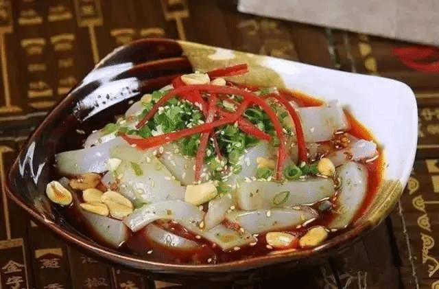【天水呱呱】呱呱是天水一带的一种特殊食品。无论是寒风骤起的严冬,还是烈日当头的盛夏,总有那紫红色的呱呱在摊点出售,食客往来不断,生意格外红火。天水呱呱品种繁多,以原料区分有荞麦呱呱、冰豆呱呱、豌豆呱呱和粉面呱呱等。其中最受人们欢迎的是荞麦呱呱。制作方法是先把陇南盛产的荞麦粉制成“荞珍子”,入水浸泡、加工,取其淀粉,然后将淀粉加水入锅,用小火烧煮,直到锅内形成厚厚一层色泽黄亮的呱呱时,方可取出装入盆内加盖,经过回醒,即可食用或上市。天水呱呱的吃法也比较独特,先将呱呱撕成小片,再配上辣子油、芝麻油、芥末、酱油、食盐、醋、蒜泥等调料即可。如果说西北人喜食酸辣,那么天水呱呱可是典型的辣味小吃。若初食者,面对满碗流红的呱呱,定会咋舌、冒汗。而当地人尤喜以呱呱为早点,一些男女几乎“不可一日无此君”。