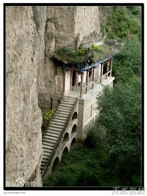 【秦岭镇分水阁】 在甘肃天水市秦州区秦岭镇一处海拔1912米的喇嘛山主峰上,有一座小庙名“分水阁”,始建于清乾隆五年(公元1740年),起初一大间为马鞍架式的土木结构,坐北朝南,古朴典雅。1940年扩充为三间又加两偏殿。这座平常的不起眼的小庙却与众不同,十分奇特。每逢降雨即出现“一檐前后水,分走两江河”之奇妙的自然景象。即前檐之水经盘龙山脚下向北流入铁炉乡,流入金河,入籍河,后汇入渭河入了黄河到渤海;后檐之水向南东折经牡丹乡流经木门道入西汉水汇入嘉陵江最后入长江到东海。