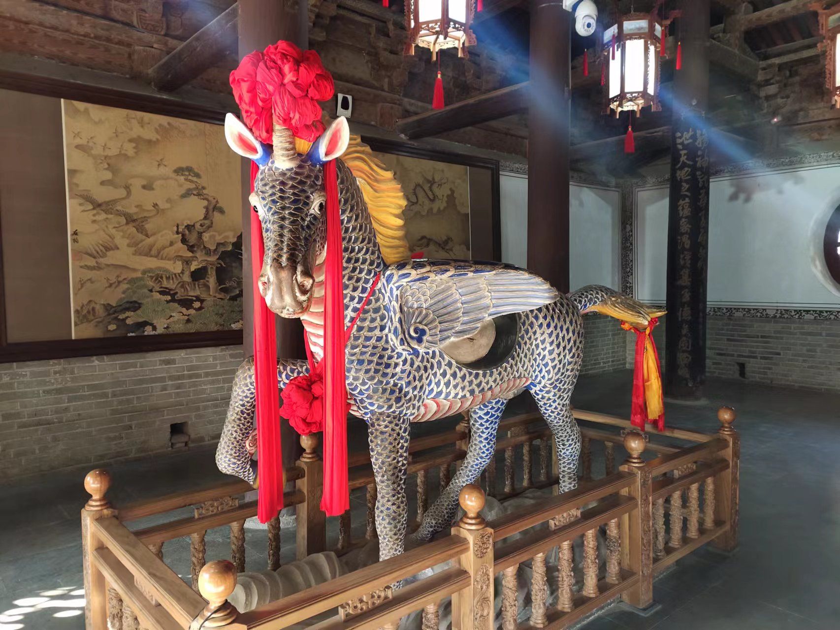 伏羲庙里有一尊龙马雕像,这尊龙马头有角,背有双翼,身附鳞甲,似马非马,已有龙的雏形,可称龙马。新制作的龙马塑像围栏长3.2米,宽1.3米,高0.68米,厚重典雅,制作精美,选用天水核桃木,木材坚硬,纹理朴素。围栏由8根长方柱和36根圆柱组成,柱身均雕刻龙纹,寓意中华民族是龙的传人,伏羲是龙祖,伏羲庙是龙庙。长方柱柱头有“八球望天”,多处雕有团云、莲子、四海水纹等传统吉祥图案。柱下放石墩,隔绝湿气。天水当地百姓感念伏羲的功德,在先天殿彩塑了这座威武雄壮、踏浪而行的龙马像,龙马像已成为伏羲庙的吉祥圣物。