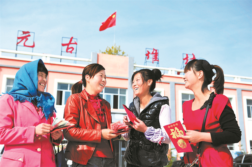 背景资料:图中是2015年10月9日,定西市渭源县田家河乡元古堆村举行股金分红发放仪式,为村民们发放了30多万元股金分红,李兰香、莫芳萍、郭丽丽、王彩桃(图中从左到右)领到分红后开心地笑了。李兰香、莫芳萍、郭丽丽是村里的建档立卡贫困户,2012年他们的家庭人均可支配收入都只有1600多元,王彩桃家(非建档立卡户)的人均可支配收入也只有2600多元。2013年以来,她们响应政府号召,入股企业参与分红,加入合作社发展产业,参加培训班学习技术,增收渠道不断拓宽,家庭收入持续增长,生活焕然一新,如今,他们的家庭人均可支配收入较2012年增长8倍多。