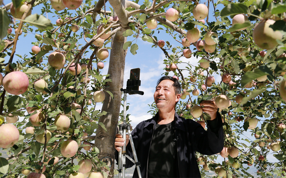 背景资料:图片中的主人公张加成已年过六旬,是陇南市礼县年龄最大的农民主播,此刻,他正在果园用手机直播带货,镜头跟随着他剪枝、采摘、分拣、套袋、装箱、运输……直播间里除了苹果,偶尔也会出现花椒、木耳等陇南当地的农特产品。2013年,在陇南市大力发展电子商务的大环境下,礼县鼓励广大农民积极参加电商培训班,张加成在培训班里第一次学会了使用网络,并通过QQ群当年卖出苹果8000斤。2016年,他的“礼县香果满园”淘宝店年销售苹果4000多箱,利润十万余元。2017年,他创办了礼县香果满园果业农民专业合作社。2018年,张加成家顺利脱贫。