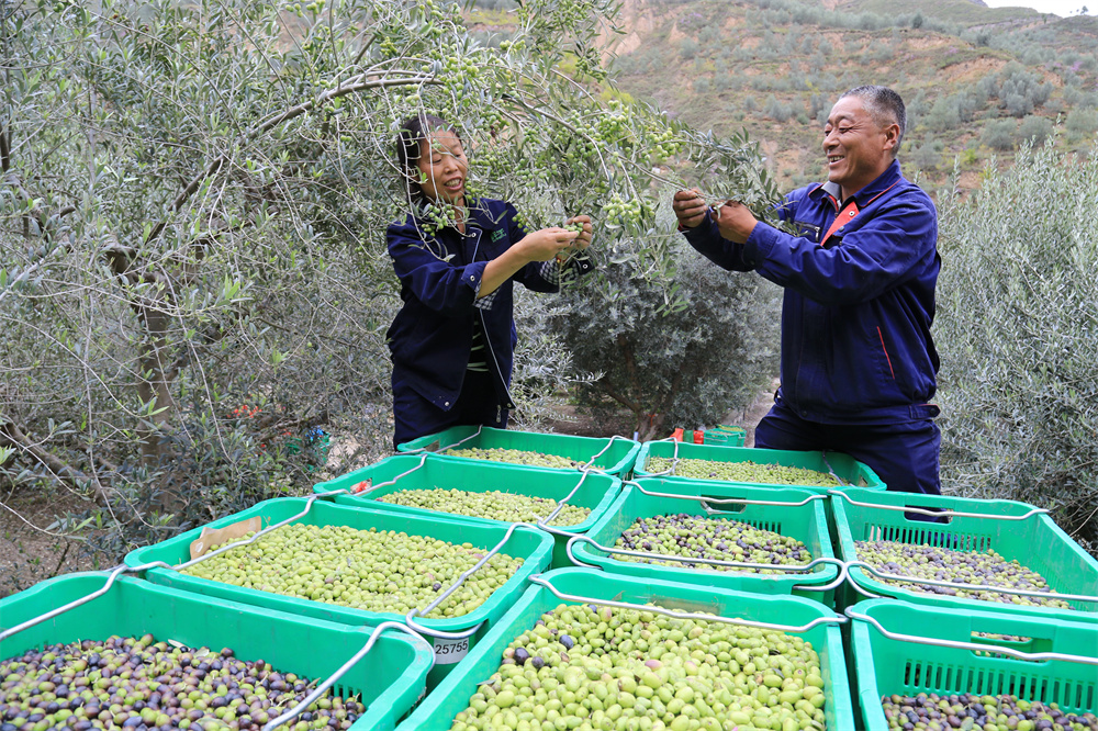 图11:壮大县域经济规模,实施“强县域”行动。橄榄油产业已成为甘肃省陇南市武都区的支柱产业,种植面积达75.96万亩,产量和产值全国领先。图为武都区农民在采摘油橄榄。