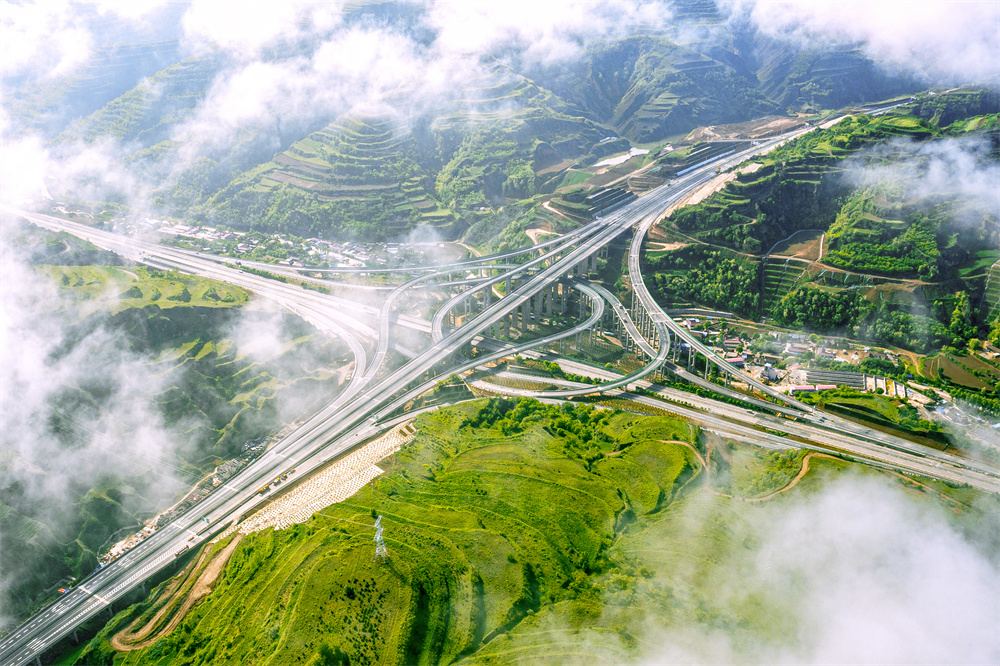 图1:脱贫攻坚,交通先行。“四好农村路”高质量发展,城乡路网加快建设。全省14个市州实现高速贯通,全部乡镇和建制村通硬化路、通客车。图为位于甘肃省庆阳市庆城县的甜永高速史家山枢纽互通式立交桥。