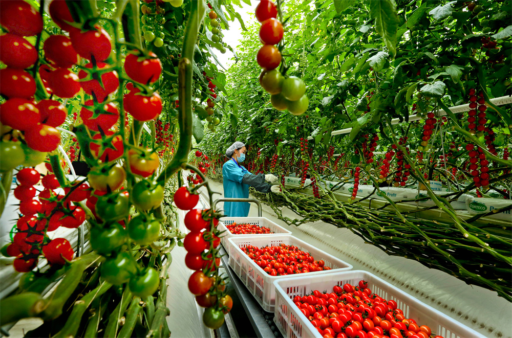 图7:现代寒旱特色农业产业发展新格局加快形成。设施农业种植规模达200万亩,年产值320亿元,150万传统农民转变为新型职业农民。图为甘肃省张掖市民乐县智能温室采摘串番茄场景。