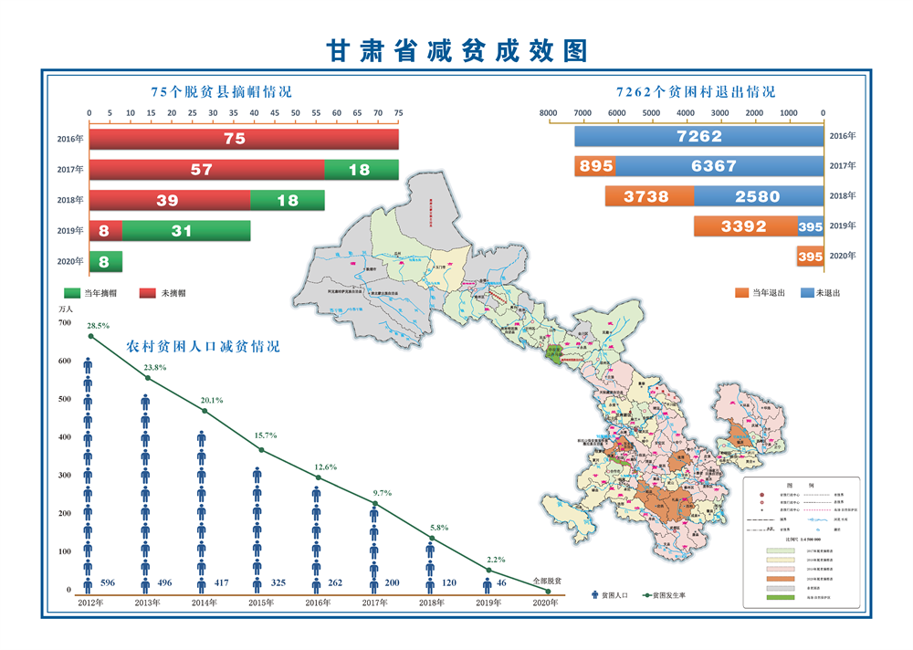 图2:甘肃省减贫成效图。历史性解决了绝对贫困问题。截至2020年,75个贫困县全部摘帽,7262个贫困村全部出列,552万建档立卡贫困人口全部脱贫。
