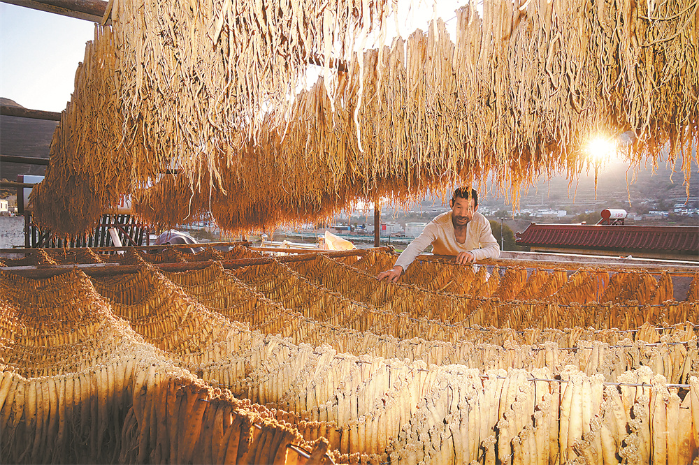 图4:发展产业,稳定脱贫。大力发展“牛羊菜果薯药”等特色产业,中药材、马铃薯、苹果产量居全国前列,2021年中药材种植面积483万亩,产量140万吨;马铃薯种植面积1020万亩,产量1480万吨;苹果种植面积664万亩,产量680万吨。图为甘肃省定西市岷县茶埠镇中药材种植户晾晒党参。